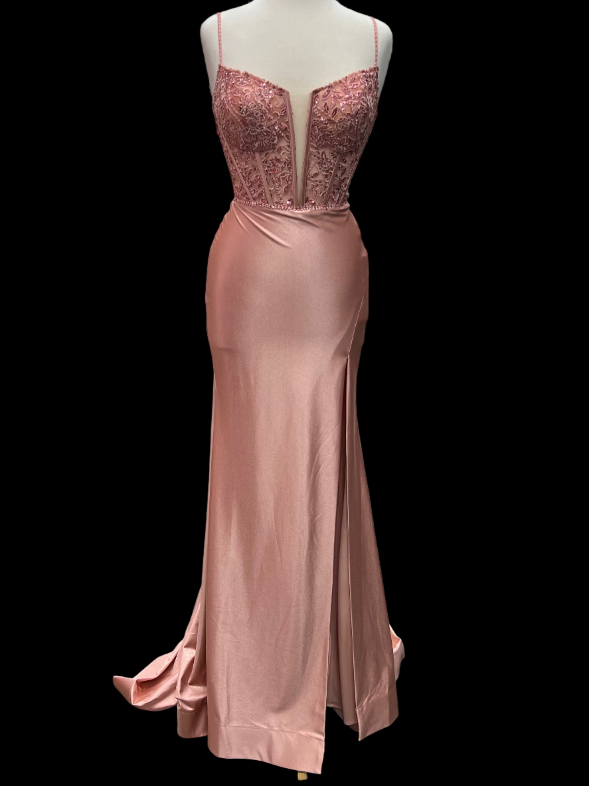 Step into effortless elegance with the Blush Alissa Deep-V Satin Gown — a beautifully crafted silhouette that blends romantic detail with sleek, modern glam. The structured bodice features a daring deep V neckline supported by illusion mesh and adorned with delicate floral appliqué and hand-beaded embellishments for a soft, feminine shimmer.