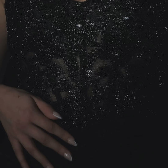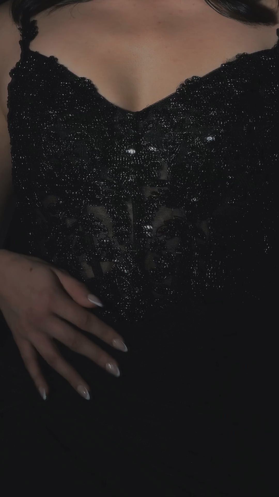 This black beaded mesh gown is designed with a sheer embroidered bodice, spaghetti straps, and a draped waistline that flatters every curve. The high slit adds a daring touch while keeping the look refined and sophisticated.