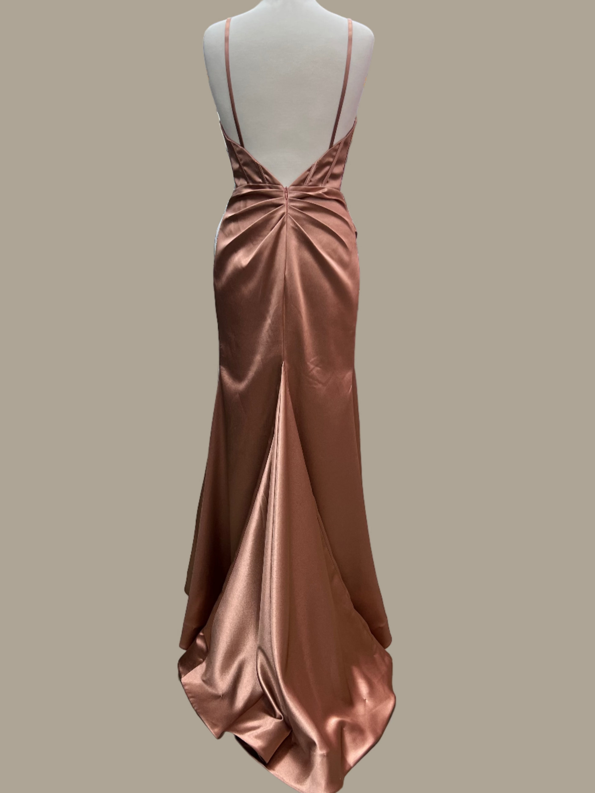 The luxe satin skirt drapes seamlessly across the waist with soft ruching that flatters the figure, flowing into a sleek silhouette with a thigh-high slit for the perfect touch of allure. Ideal for formal evenings, galas, weddings, and red-carpet moments, this gown blends modern glam with timeless femininity.